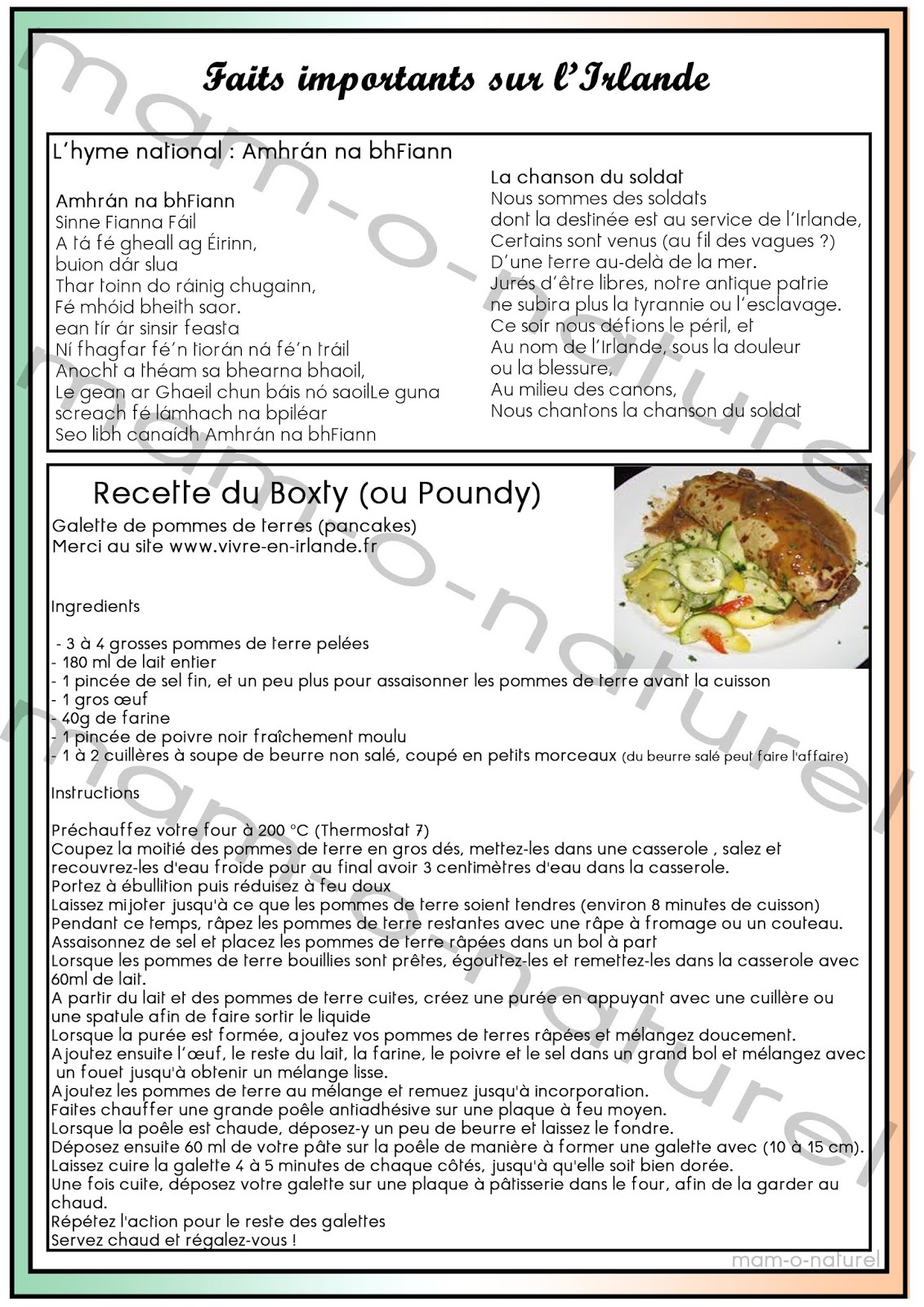 Ainsi qu'un pack de cartes de nomenclature et de cartes explicatives + l'hymne nationale traduite ET une des recettes traditionnelles les plus appréciées ;) accessible gratuitement. Un gros merci aux contributeurs de Wikipédia ainsi que les sites passionnés d'Irlande sans qui je n'aurais pas pu accumuler autant d'informations ! (bouton télécharger plus bas :))